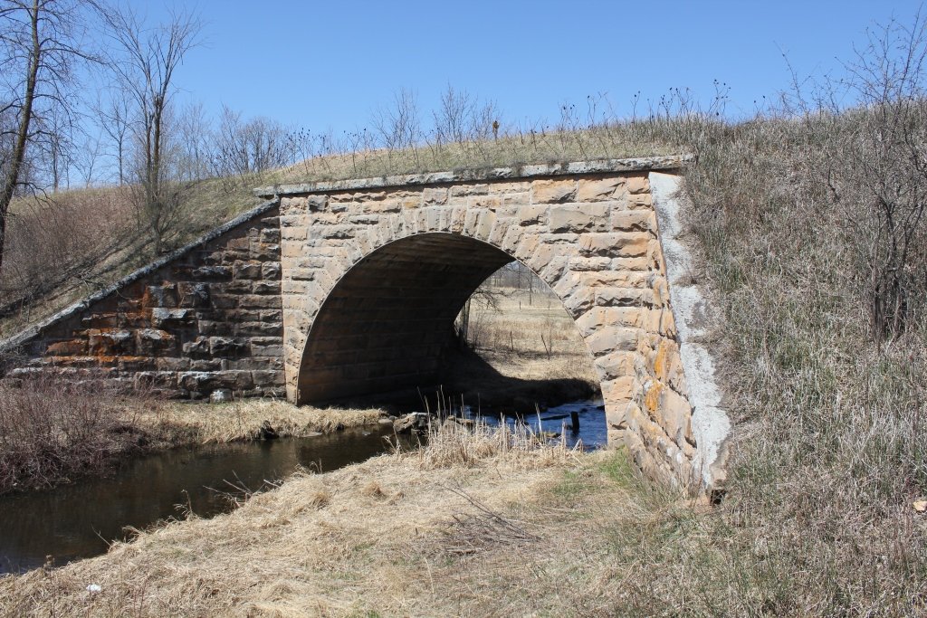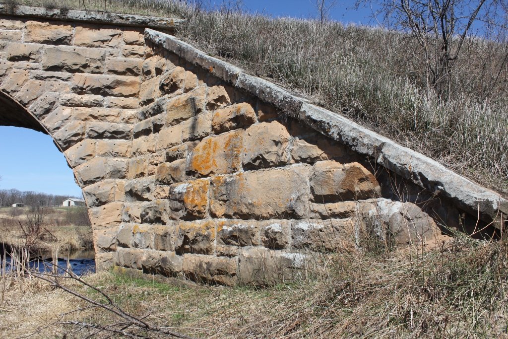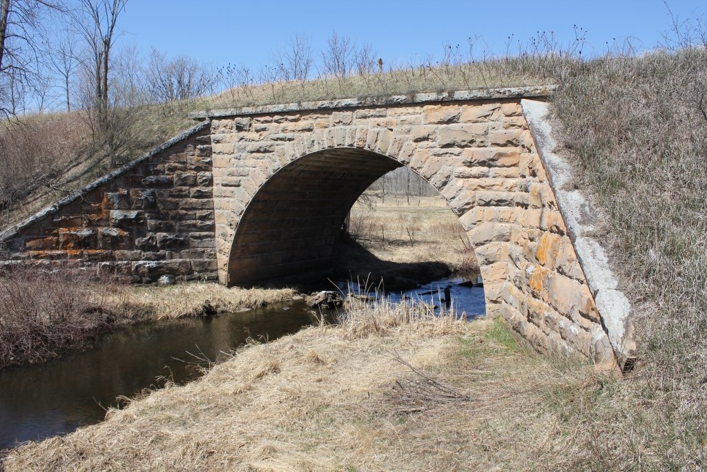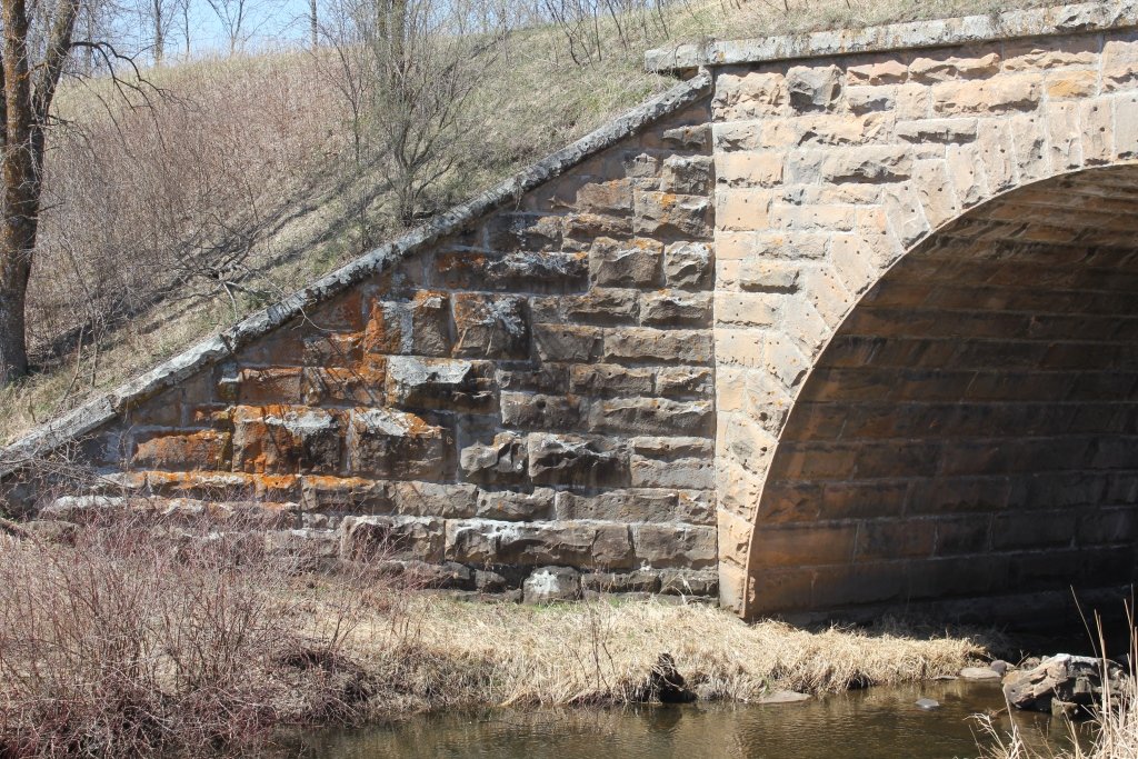 Built in 1892, the bridge crosses the Little Groundhouse River. This massive stone arch features smooth cut stone, large wing walls and an overwhelming size.