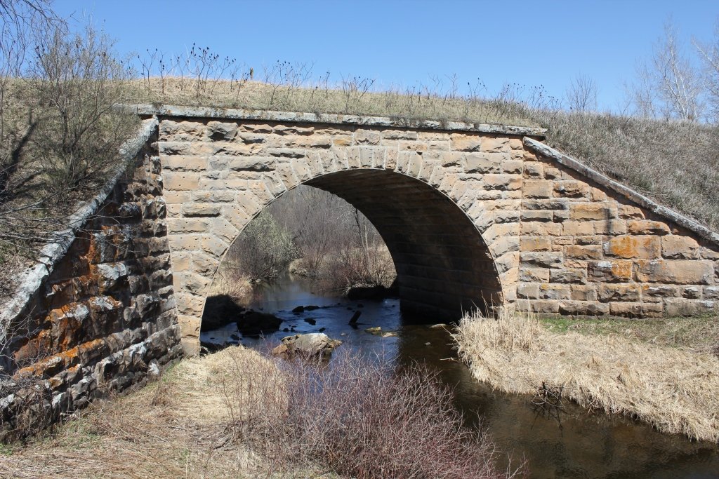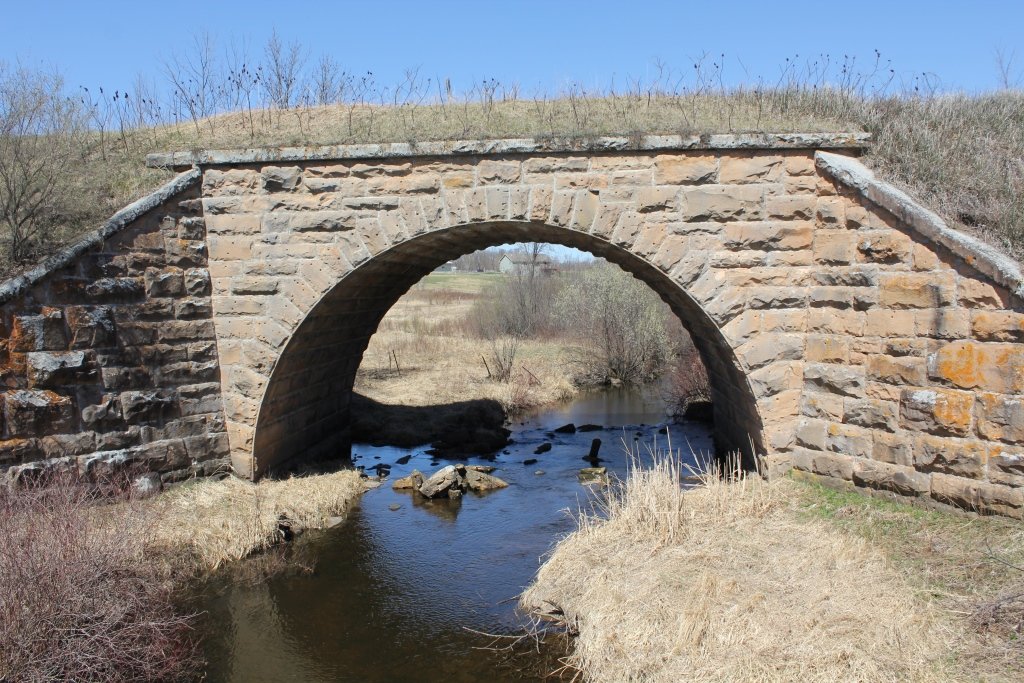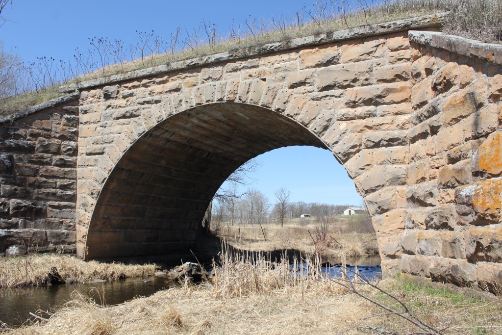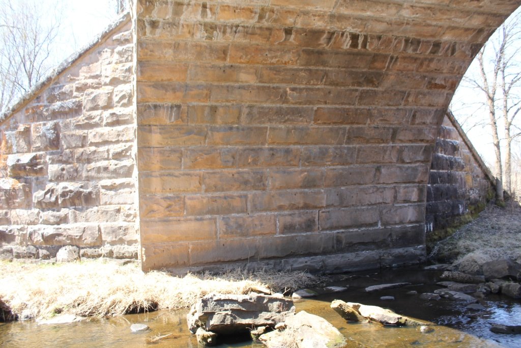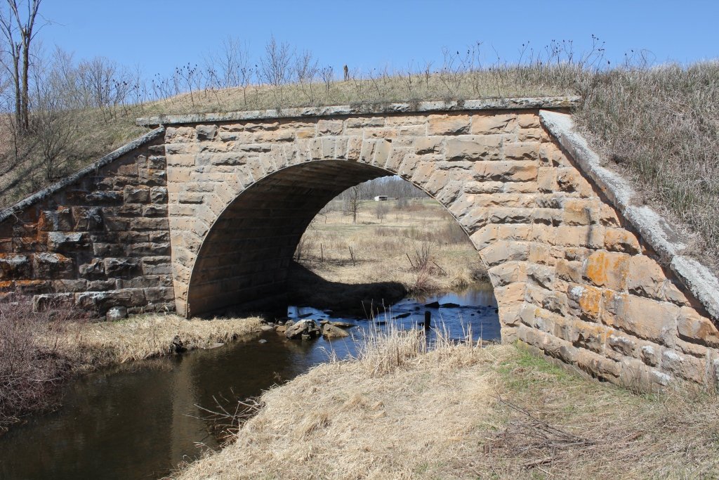 Built in 1892, the bridge crosses the Little Groundhouse River. This massive stone arch features smooth cut stone, large wing walls and an overwhelming size.