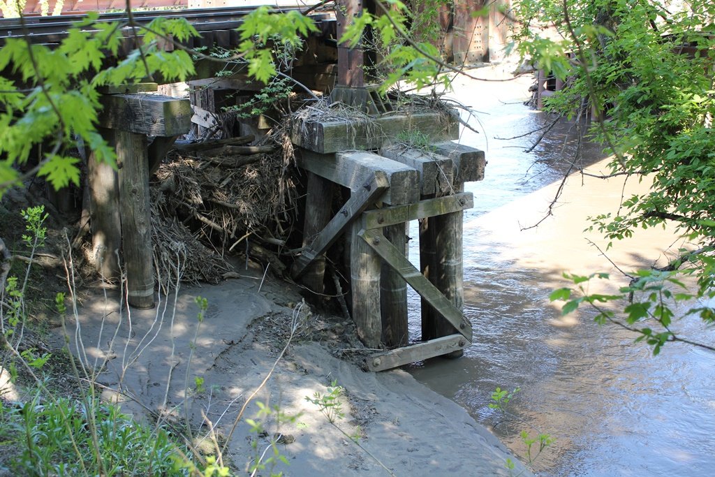 Resting entirely on wooden substructures, this bridge remains in fair condition.