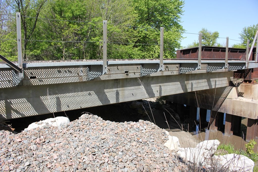 Likely built in 1906, the bridge contains a single through girder span, and is approached by modern concrete stringer spans.