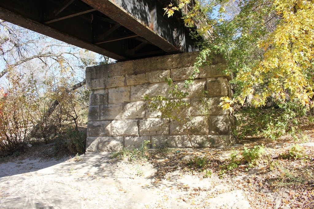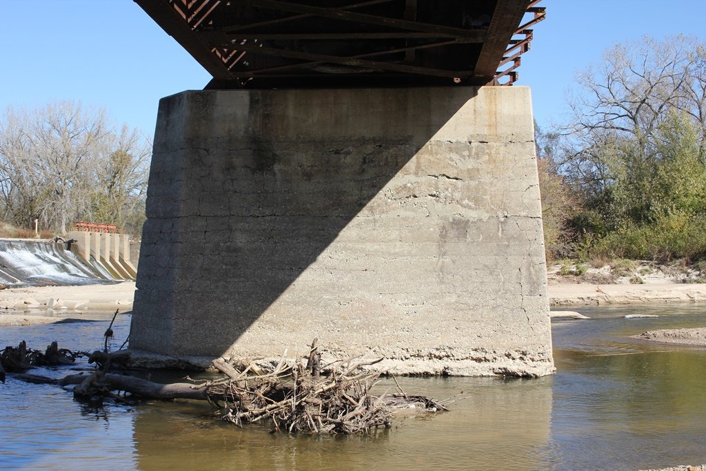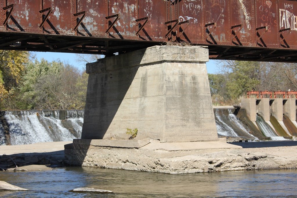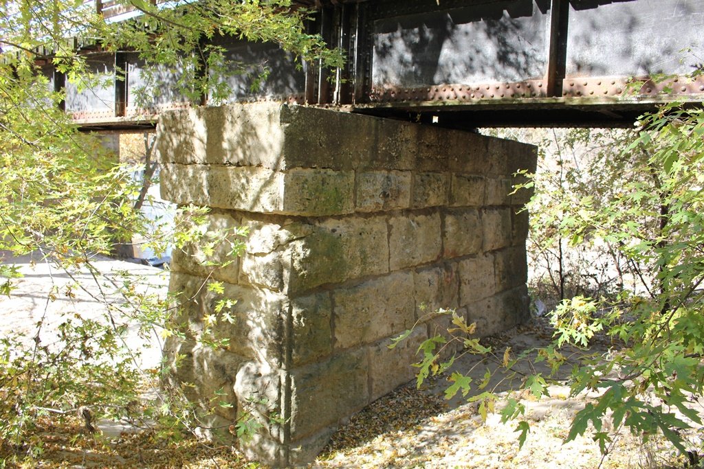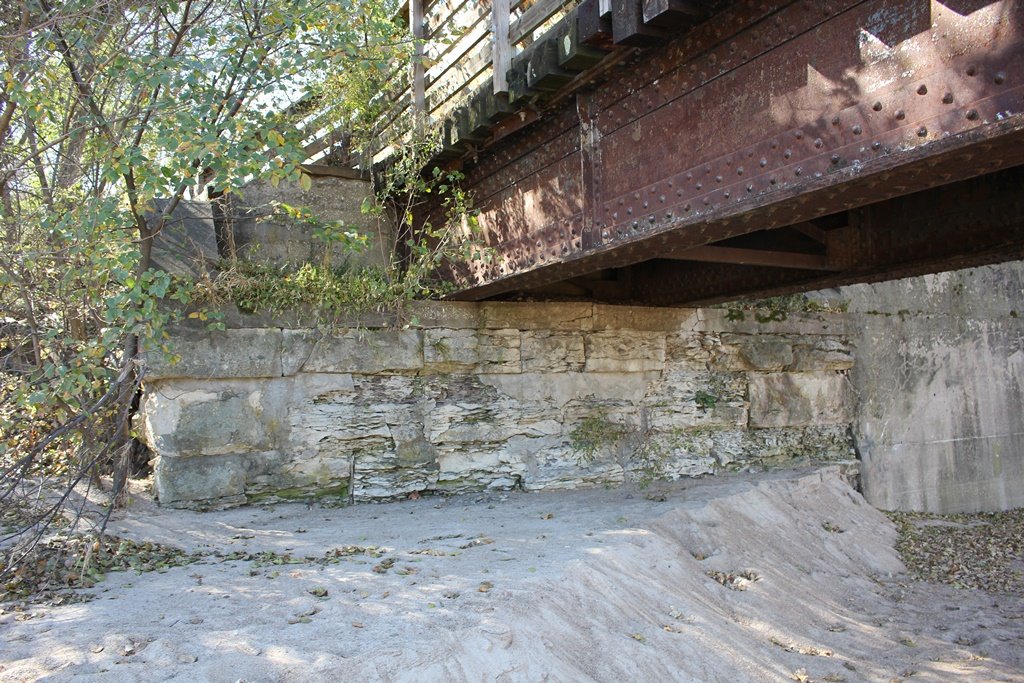 The bridge sits on a combination of stone and concrete substructures. Judging by historic photos, the west abutment, pier #2, #4, #6 and #7 are all constructed of stone, while the east abutment, pier #1, #3 and #5 are all constructed of concrete. Pier #2 and #4 have since been encased in concrete.