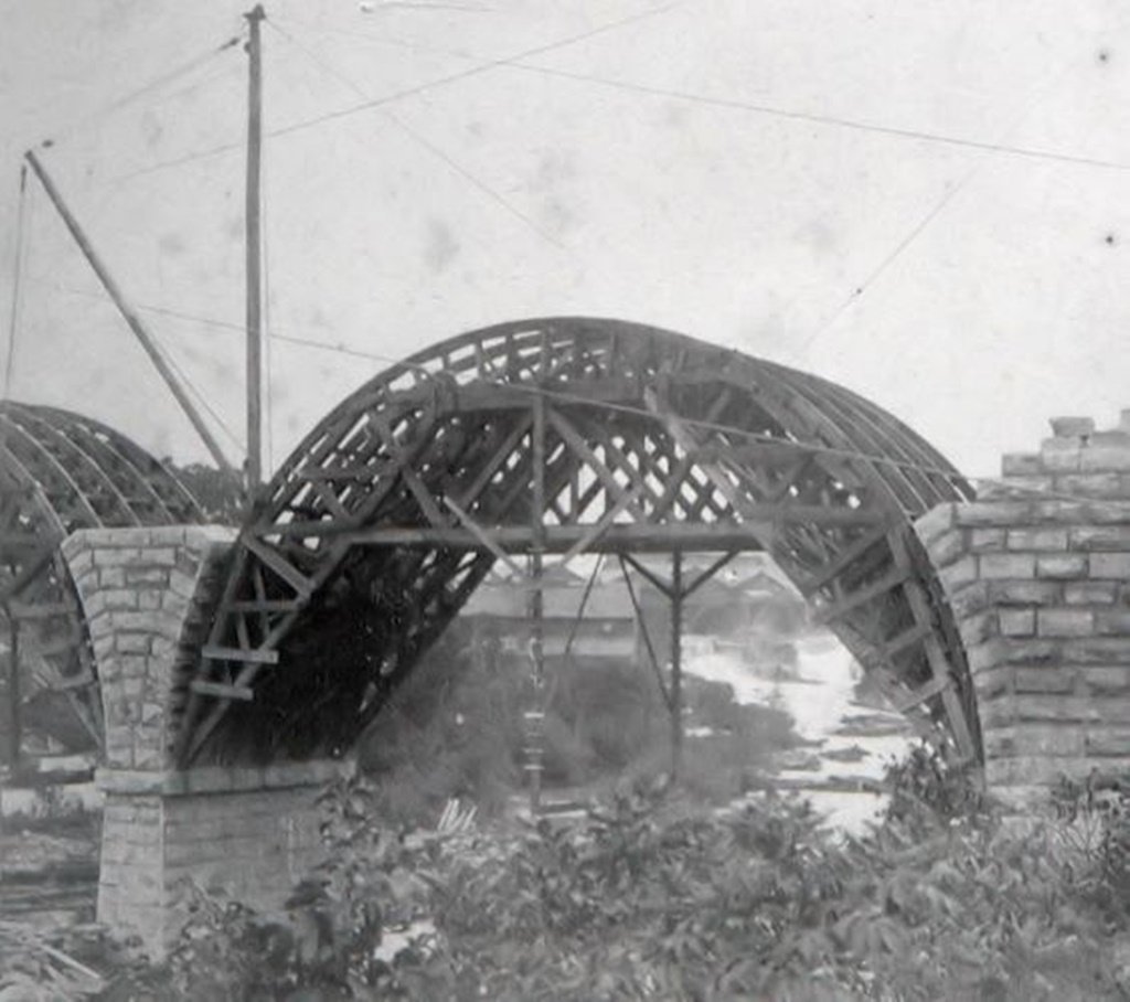 The bridge took nearly 2000 carloads of stone to complete. Original plans called for a steel bridge, which would have failed due to the changing river conditions in the bedrock.